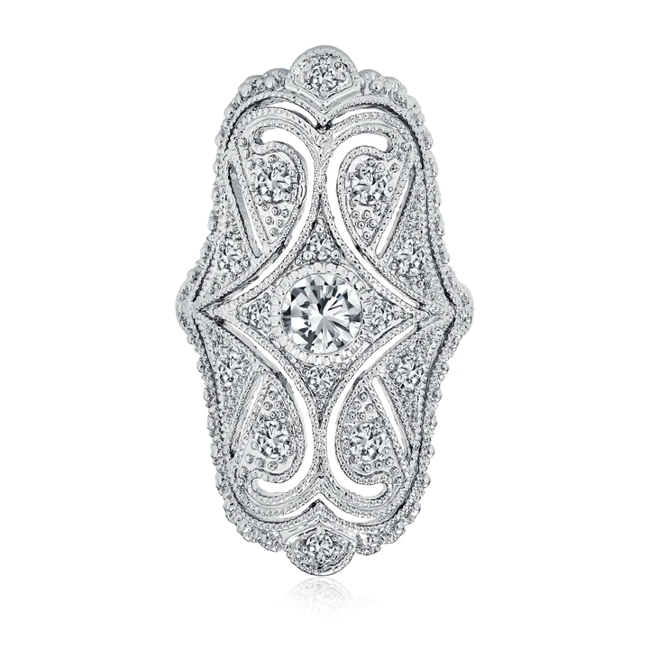 Whether you were born in April or just love a beautiful clear Cz look, this elegant art deco full finger is the perfect choice. Made of rhodium plating and a captivating filigree pattern.
