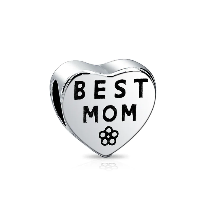 Beautifully show your love to Mom with this elegant 925 silver bead charm, Featuring a heart shape, with “Best Mom” message in a two sided design and floral detail accent.