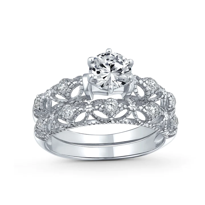 This Vintage Styled Engagement and Wedding Ring Set is sure to grab the attention of everyone. The Engagement Ring has at its centerpiece a 0.75 carat CZ Stone which simply radiates with its brilliance.